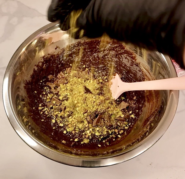 I start off easy with a box brownie mix and make it according to the directions on the package. You can certainly make homemade brownies but I used Dolly Parton brownie mix. Ghirardelli has a great one too. Regardless of your brownie batter, add some chocolate chunks and crushed pistachio before baking.