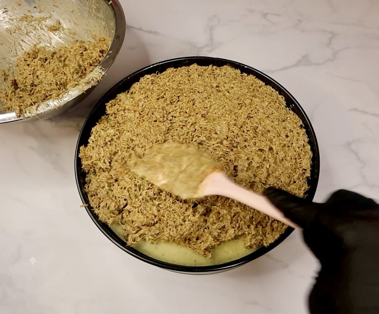 People on the internet said it isn’t Dubai chocolate unless you add tahini but I don’t like tahini in my Dubai chocolate so to make sure my Dubai chocolate brownie cheesecake isn’t a poser, I put a drizzle of tahini. You can add more or less, your call.
