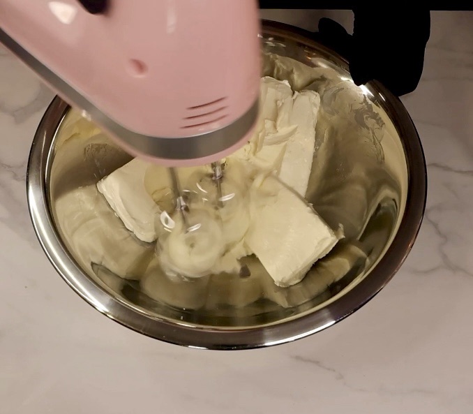 - Beat cream cheese until softened up and then add sugar and beat for a minute