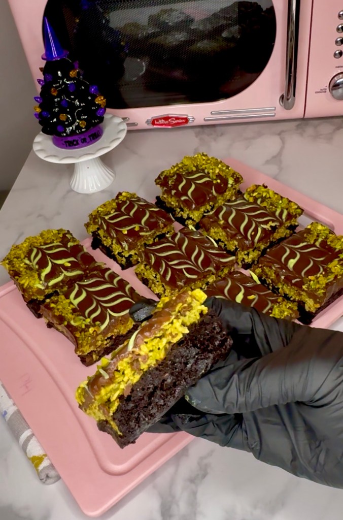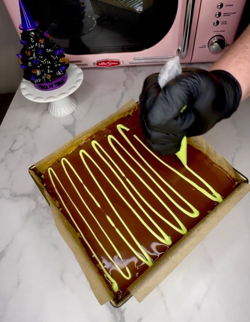 Put the chocolate in a piping bag or ziploc bag and snip the end off and make a zig zag pattern across the Dubai chocolate brownies.