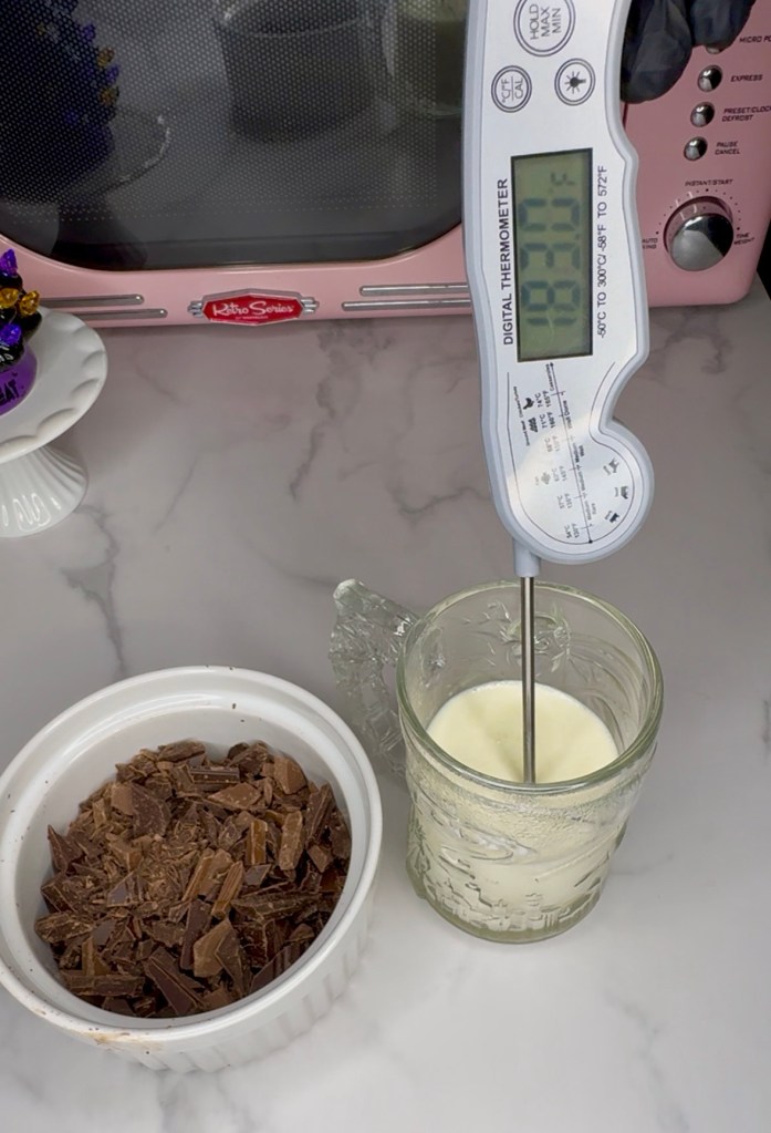 Now the ganache is a bit more scientific. While the brownies and corn C are cooling, I worked on my ganache. All you need to do is heat up 125g (weighted) heavy cream in the microwave to 176°-185°F using a thermometer for accuracy.