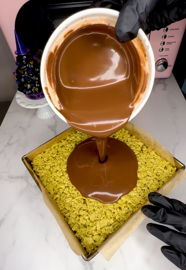 You can just do the white chocolate as the design on top of the gluten free Dubai chocolate brownies or you can add some oil based food coloring to get a green chocolate.