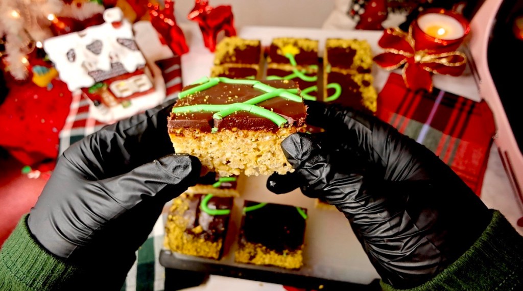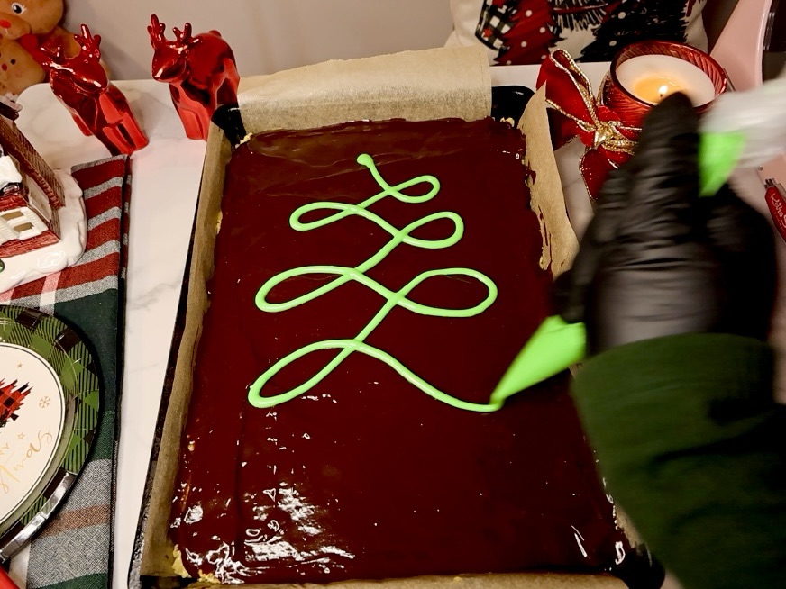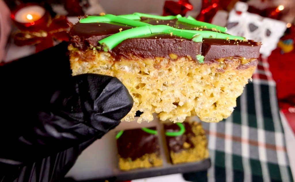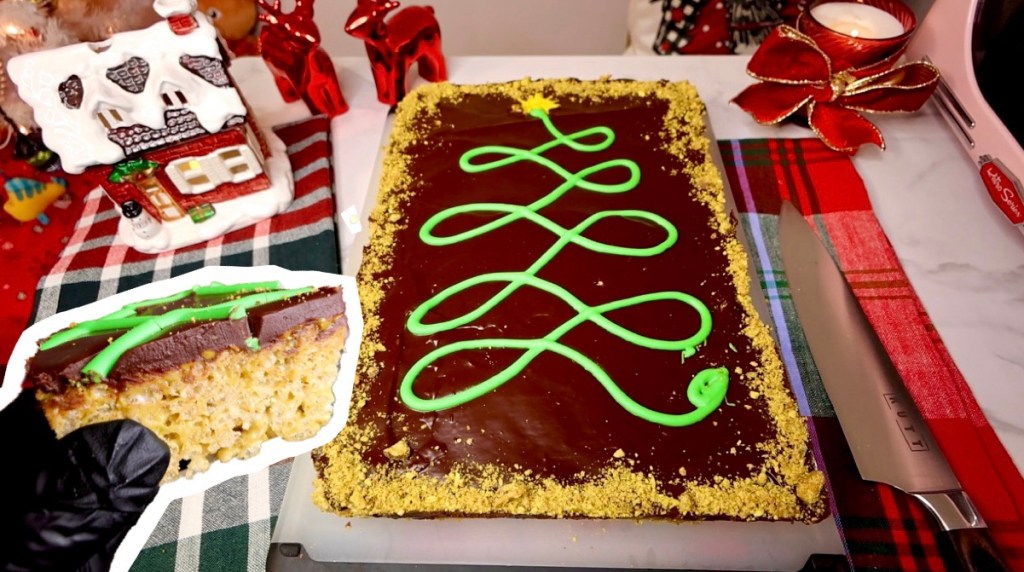 - Here’s where you can leave it or add decorations like I did for Christmas. I melted a little white chocolate and added green oil based food coloring to most of it and a little yellow for a little star on top of the Christmas tree. I add crushed pistachios around the edges of the Rice Krispies treats and then let everything set before cutting.