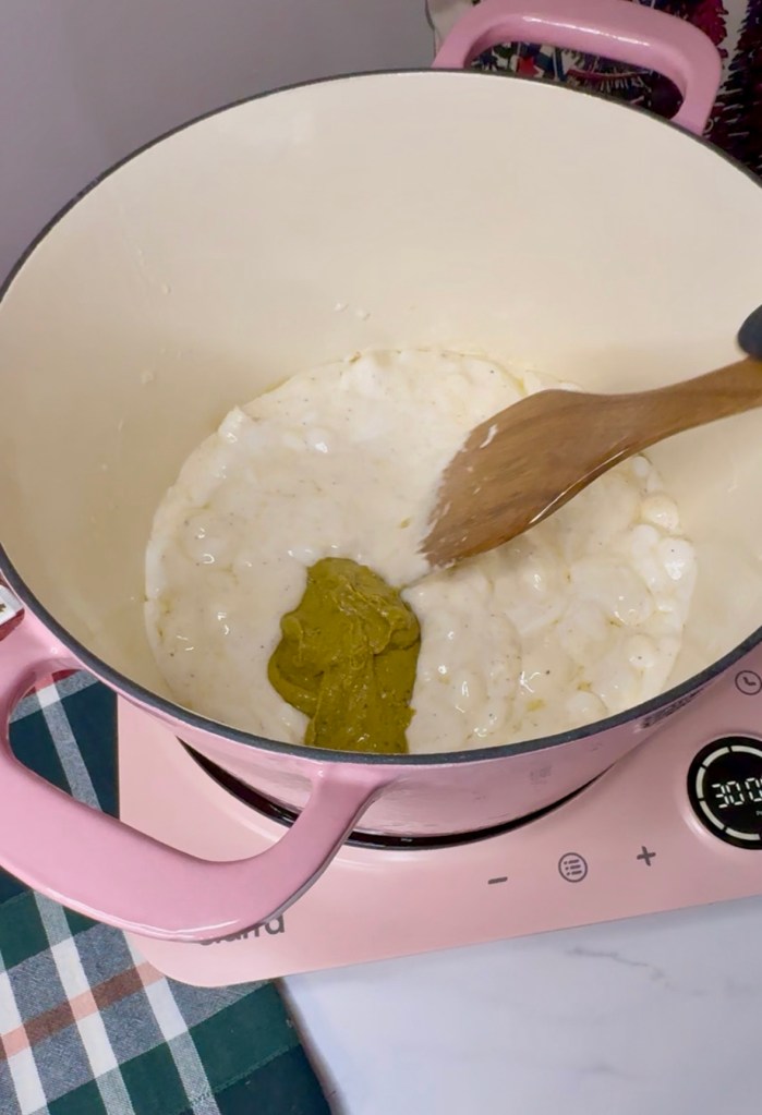 - Add 1/3 cup of the pistachio cream (and optional green gel food coloring), mix until combined