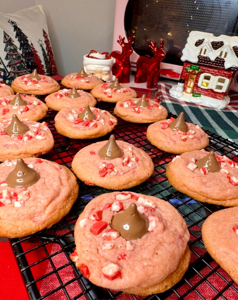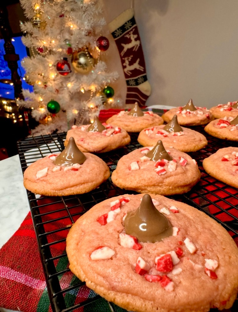 - Place parchment paper on a baking sheet and put 10-12 cookies, spaced apart for them to spread and grow and bake in a 350°F oven for 12-13 minutes. Once they come out, let them cool on the baking sheet for a couple minutes and then add the kisses, put them on a cooling rack and let them be for the kisses to melt and then reharden to keep their shape before packing them away