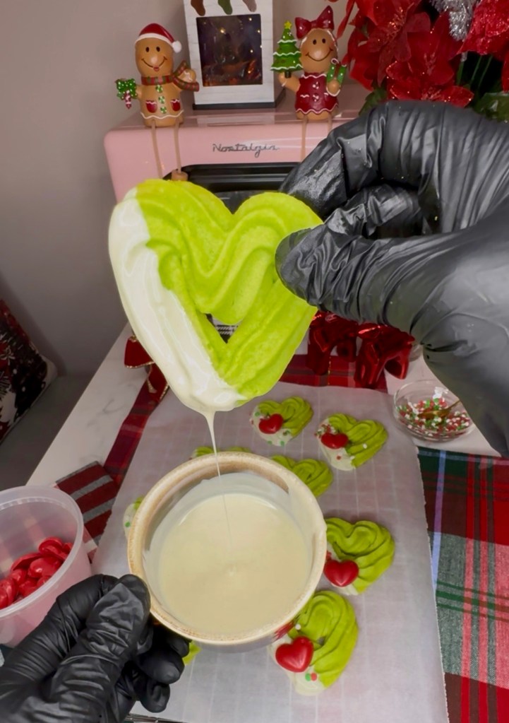 After they cool completely, I melted some white chocolate. Listen, the moser Roth Madagascar vanilla white chocolate from Aldi is incredible! But any white chocolate will do ya! Then just dip half of your grinch heart Christmas butter cookie in the white chocolate.