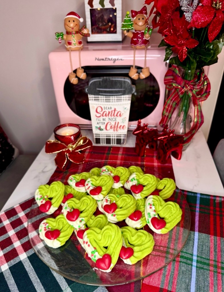 And that’s it! These grinch butter cookies were super easy to mix in the kitchen aid and then honestly, decorating them was easy too. You don’t need any sort of artistic skills to make a cute Christmas cookie for your cookie box! Or if you’re like me, just for me and my little family.