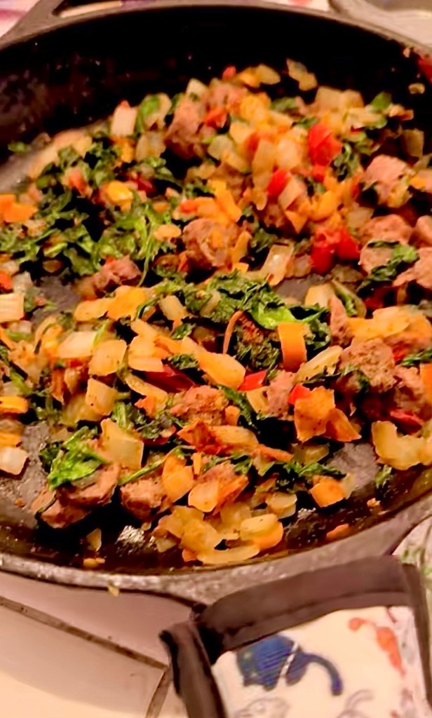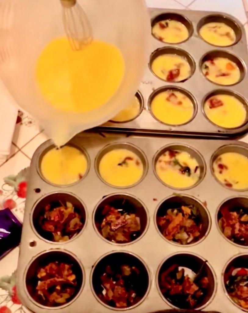 You can use whatever your heart desires for the filling of these easy egg bites. I usually use whatever veg and meat I have leftover from dinners. This version I did sautéed spinach, onions and peppers and then some turkey sausage. I did a few with some bacon too that I had. I add some seasonings like black pepper, mushroom powder and garlic powder to taste. You can add salt or even everything but the bagel seasoning too if you want.