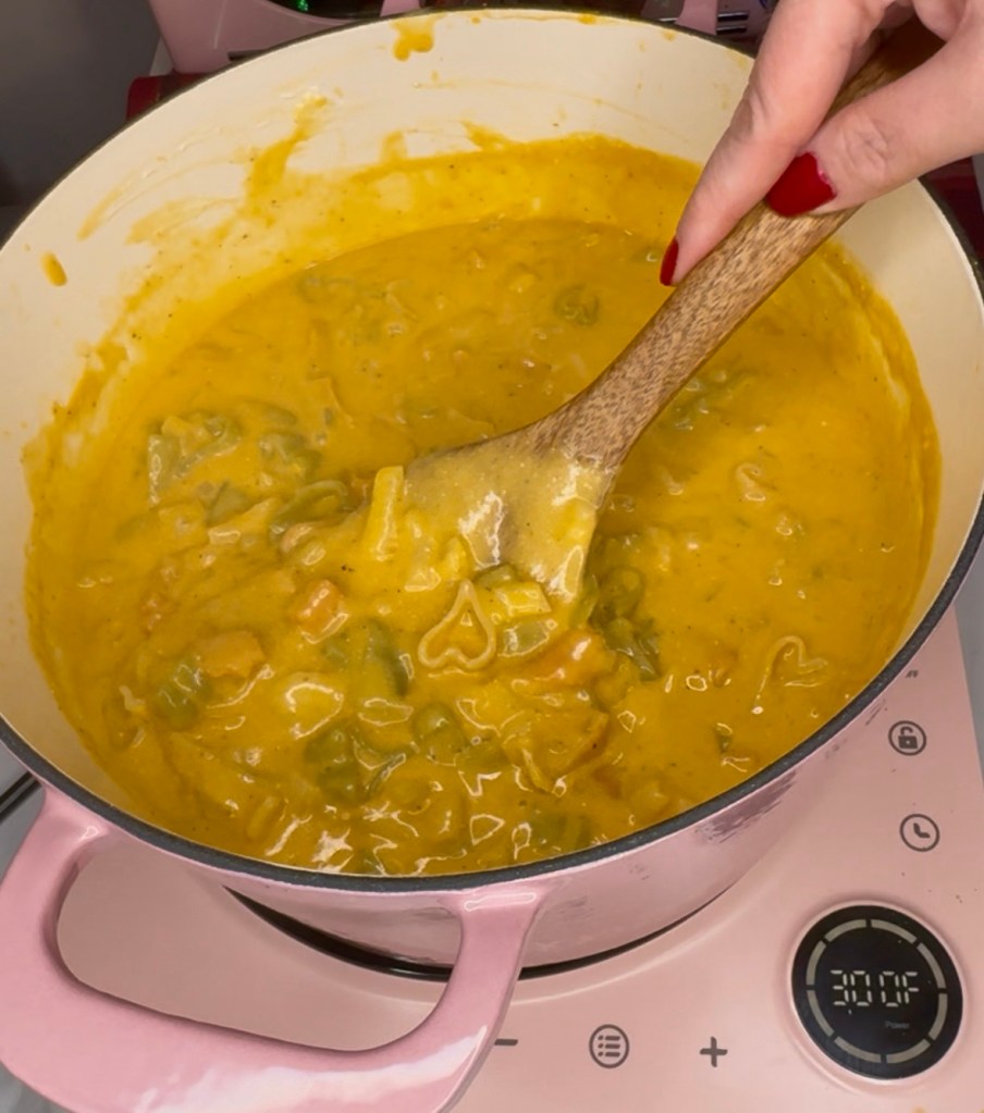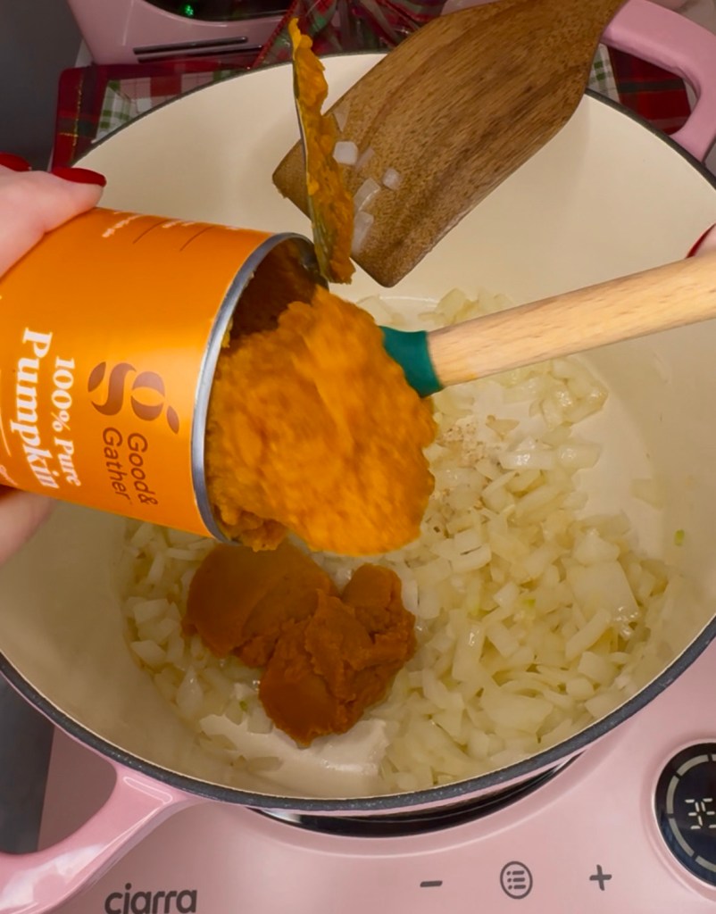 - Sauté an onion in a large pot, then add pumpkin, broth, pasta and seasonings and bring to a boil then turn down heat