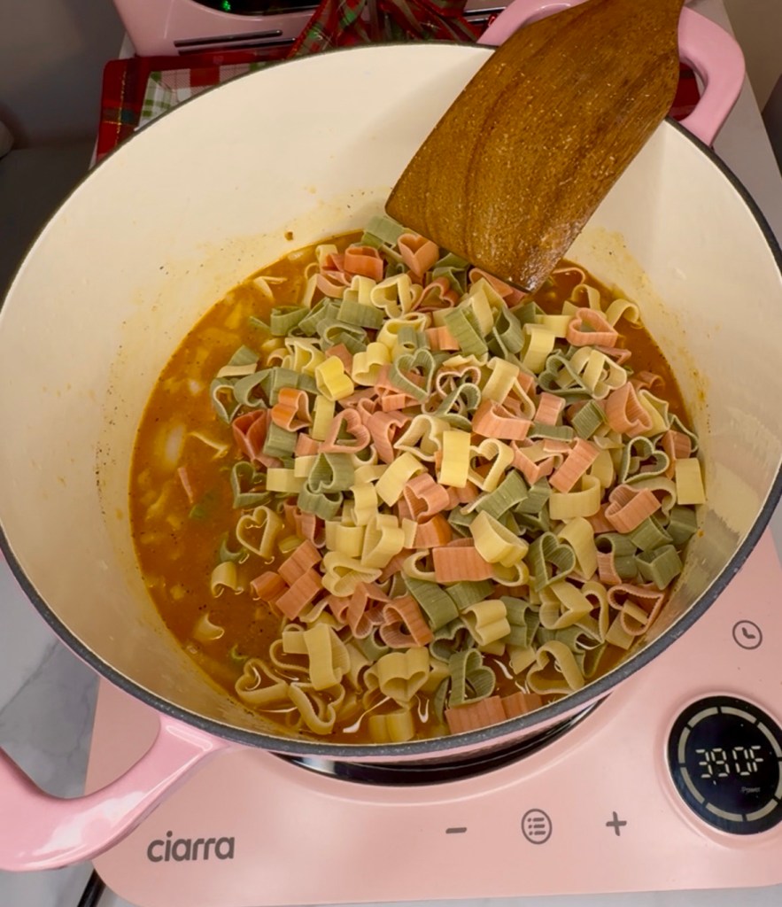 I found this heart shaped pasta at target and knew I wanted to make it with this one pot dinner. I used 2 bags so we could have lots of leftovers for the week too.