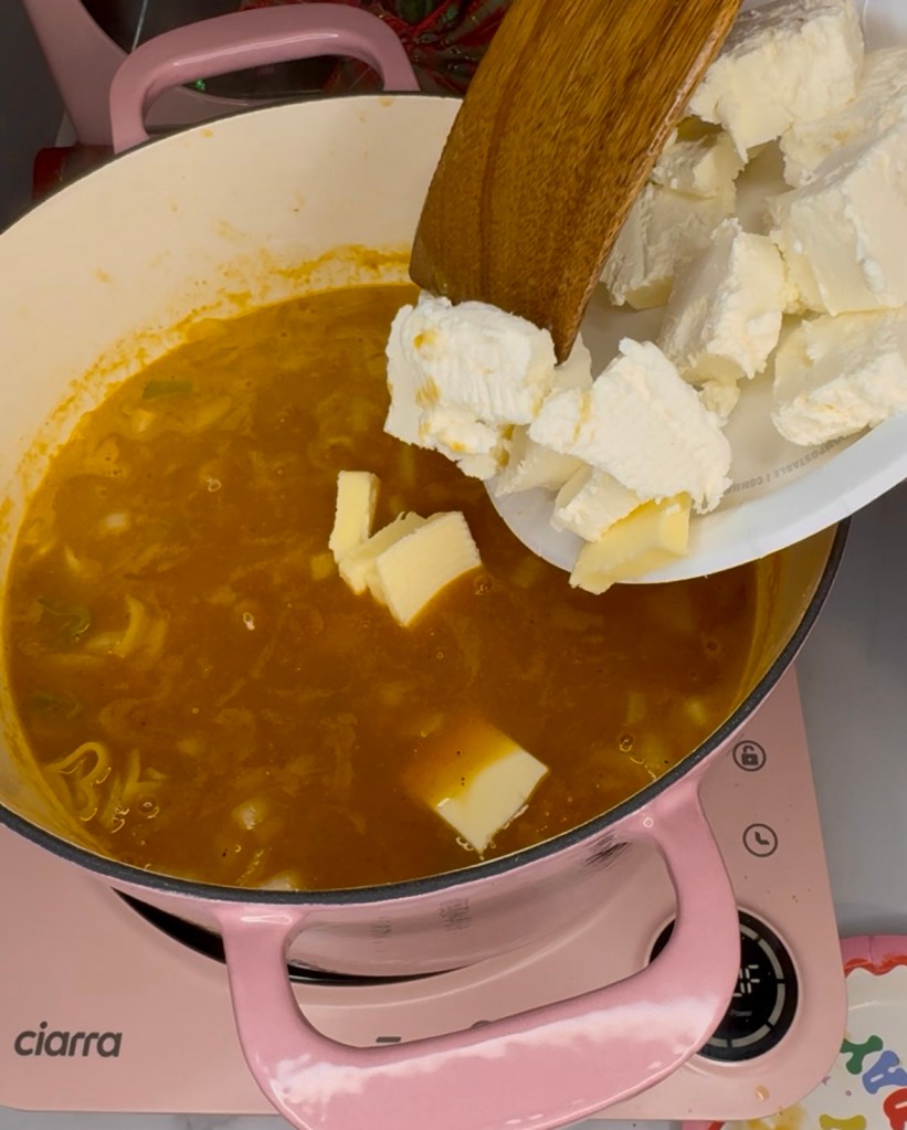 I used full fat cream cheese and unsalted butter but you can use 1/3 less fat, you can use plant based, I’m almost used an onion and chive cream cheese, I feel like that would be really good too. I’ve also added a cup of shredded cheese before too but I don’t like it as much that way unless I’m putting it into a 13×9 with breadcrumbs for a casserole vibe.