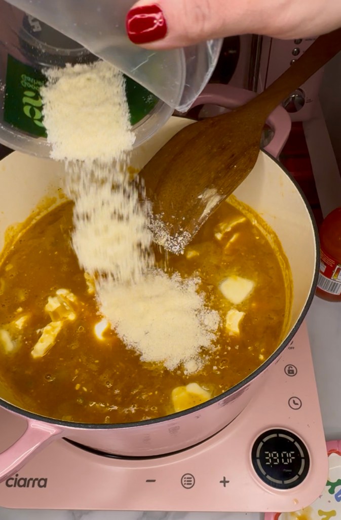 - Let simmer for about 10 minutes or until al dente (this can depend on what type of pasta you’re using) and then add butter, cream cheese and Parmesan and once melted and thickened, you’re done!