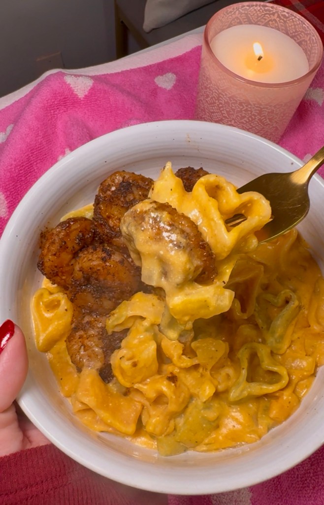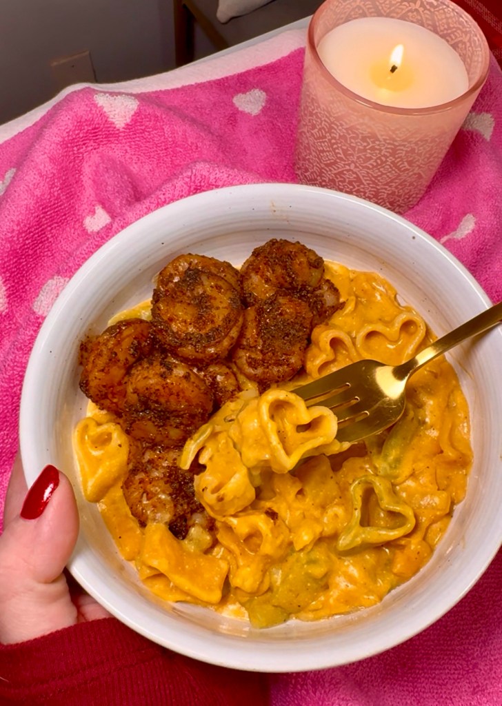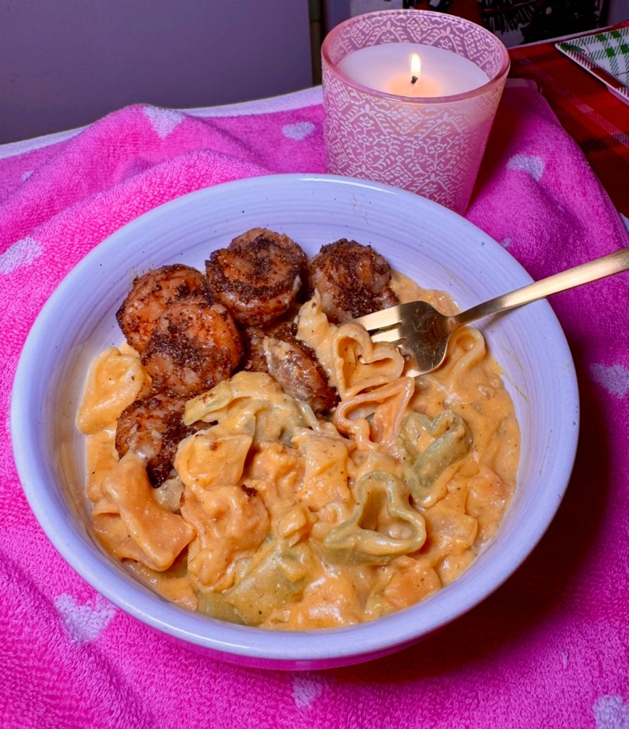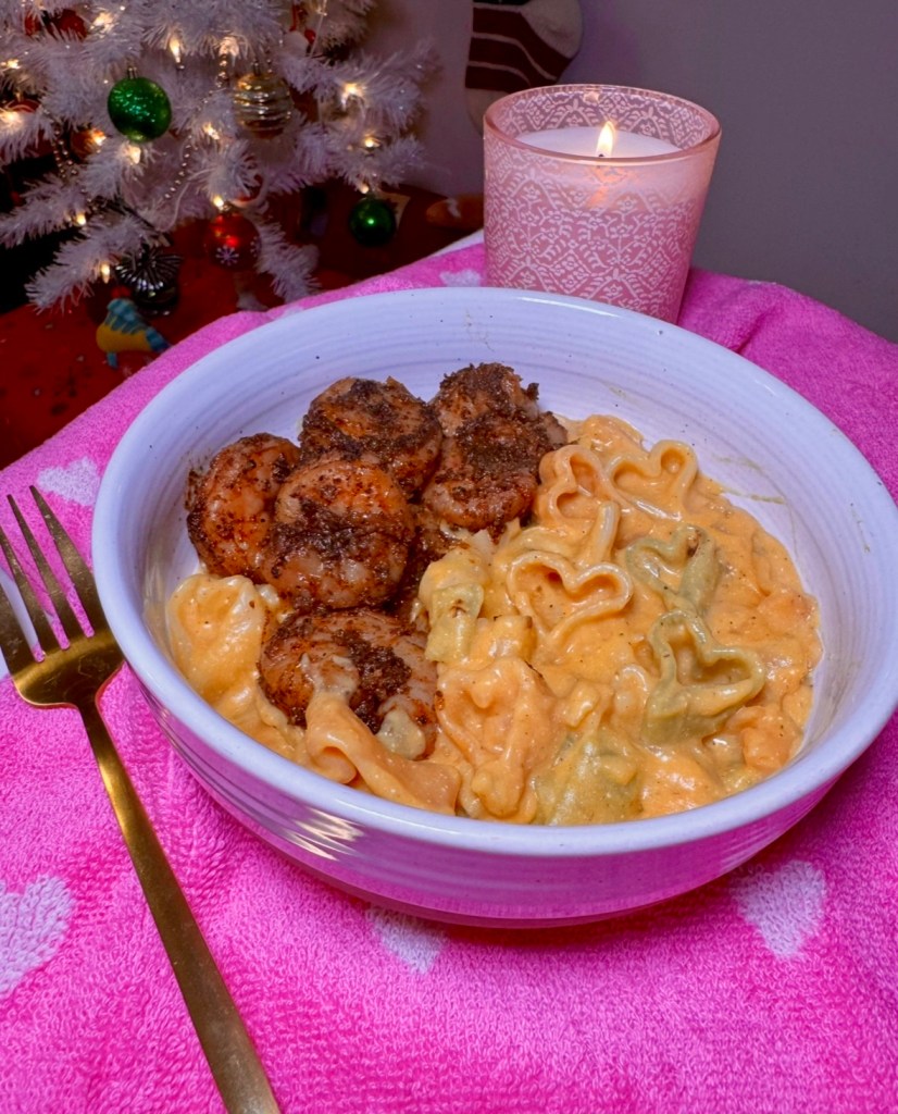 My husband makes us shrimp on the regular because it’s pretty inexpensive and on sale a lot at Target, specifically the wild caught shrimp, which is what we use because it has significantly less sodium than other frozen shrimps. I asked him for his quick recipe so I’ll share it here for you too in case you want to add it to your one pot pasta dish. It paired super well!