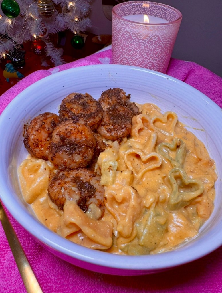 Shrimps – 1 lb wild caught shrimps, 2 tsp black pepper, 1 tsp each of onion powder, garlic powder, paprika, celery seed – preheat 1 tbsp olive oil low heat cast iron – add shrimp & seasonings, stir, 6 minutes or until internal temperature of shrimp reaches 145°F using a meat thermometer
