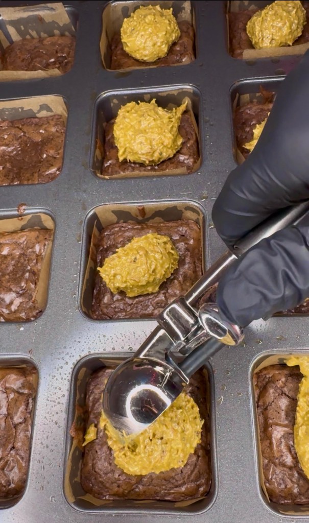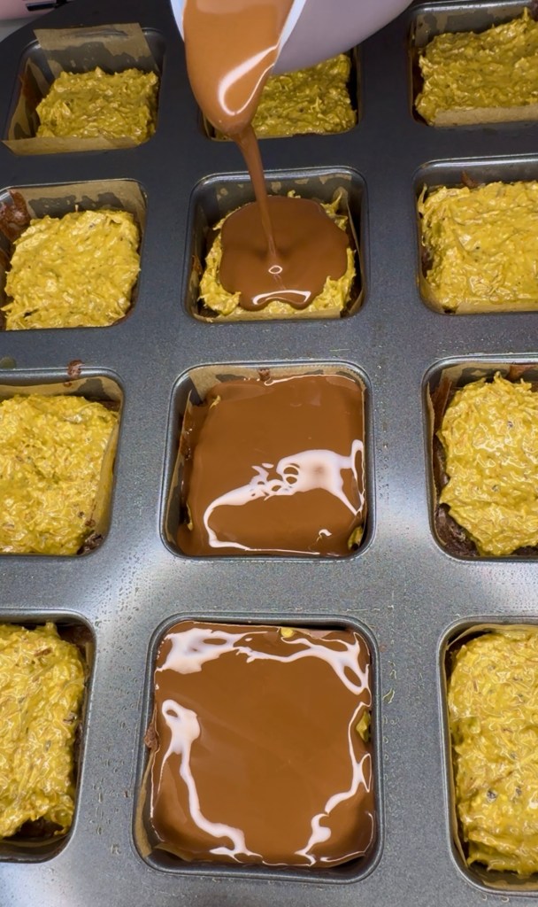 I used Kataifi from Amazon that’s already toasted so that saves a step. Just add the kataifi and pistachio butter until desired consistency. Original Dubai chocolate adds tahini to this mixture but I don’t like it. You can certainly add it. Also, if you run out of the pistachio butter, add a little cashew butter or almond butter as a last minute substitute. Wait for the brownies to cool and then add your Dubai mixture on top of each brownie.