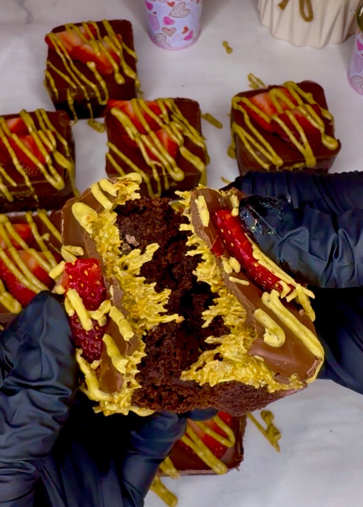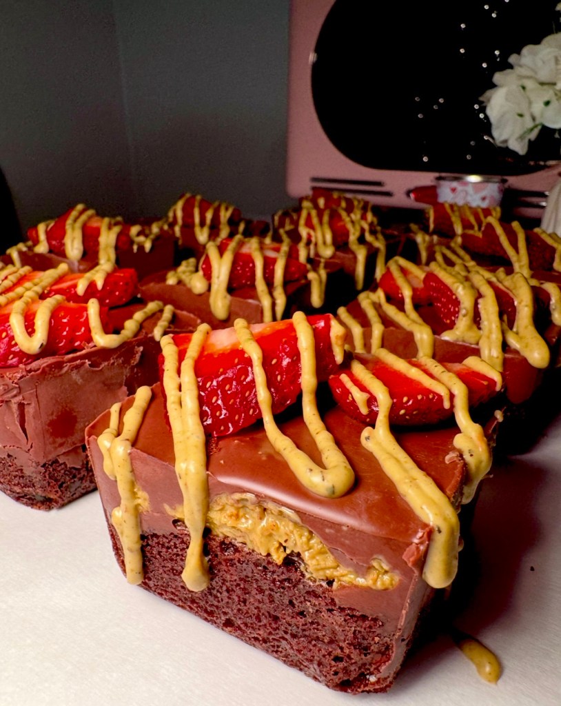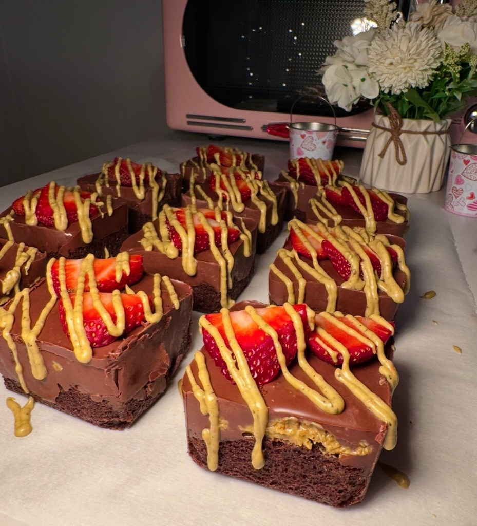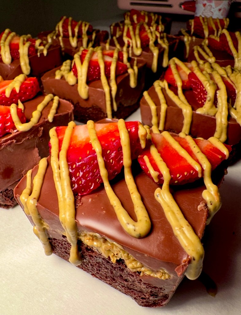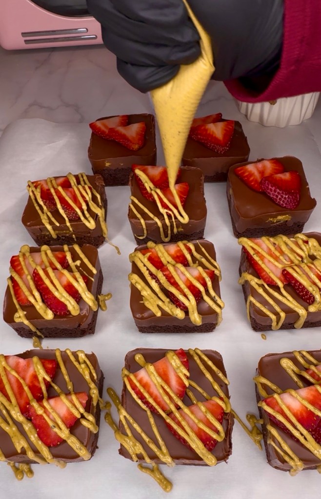 Then I added sliced strawberries on top of each Dubai chocolate brownie after I took them out of the pan. I melted white chocolate and added a small amount of pistachio butter and then added it to a piping bag, nipped the tip and did a quick drizzle on top for the ultimate crumbl cookie Dubai chocolate strawberry brownies vibe!