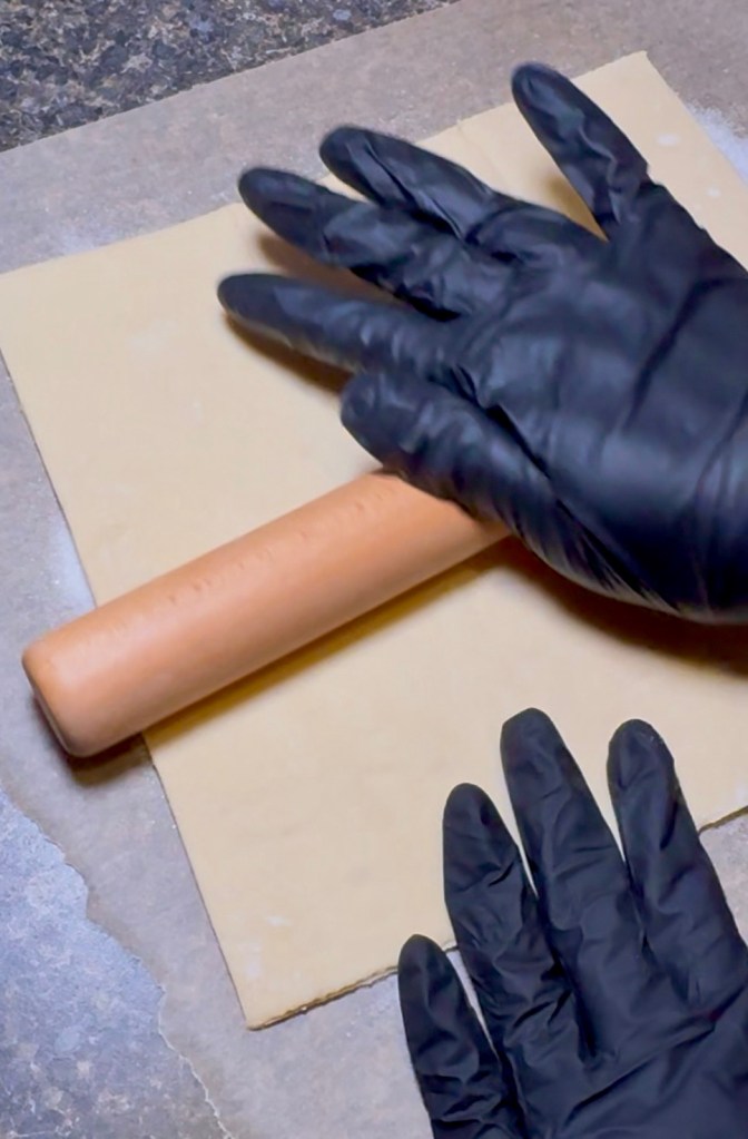 Put 1 sheet of puff pastry on top. I use the frozen puff pastry from the grocery store, just make sure it’s been thawed in the fridge and roll it pat it a little bit so the sugar sticks to it