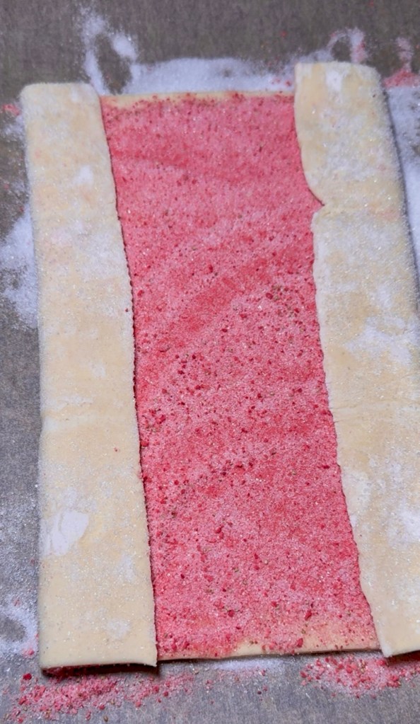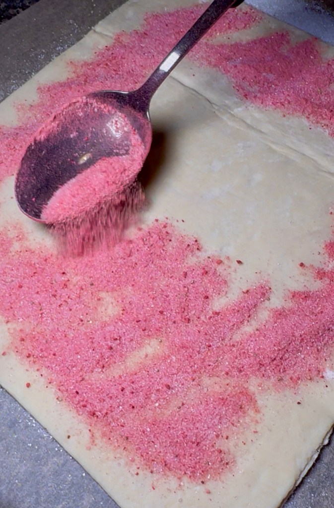 Then I used a blender to mix 14g freeze dried strawberries (about half of a 1 oz bag) and 1/2 cup granulated sugar together and sprinkle it over the puff pastry and spread out on the whole sheet