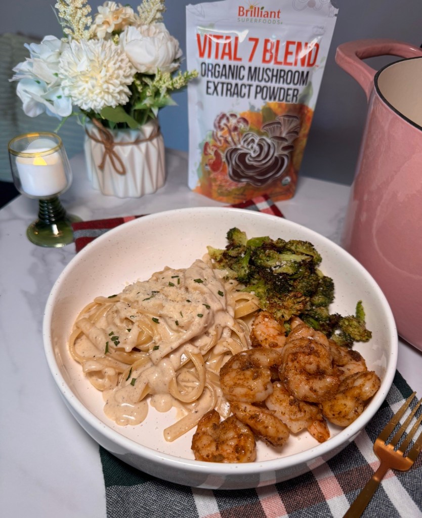 I keep this dinner dish really simple with some fresh cracked black pepper, minced garlic and my favorite Organic mushroom powder for extra umami flavor and nutrients.