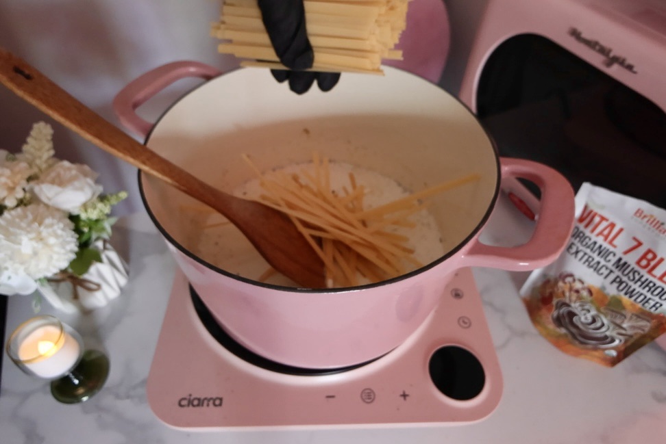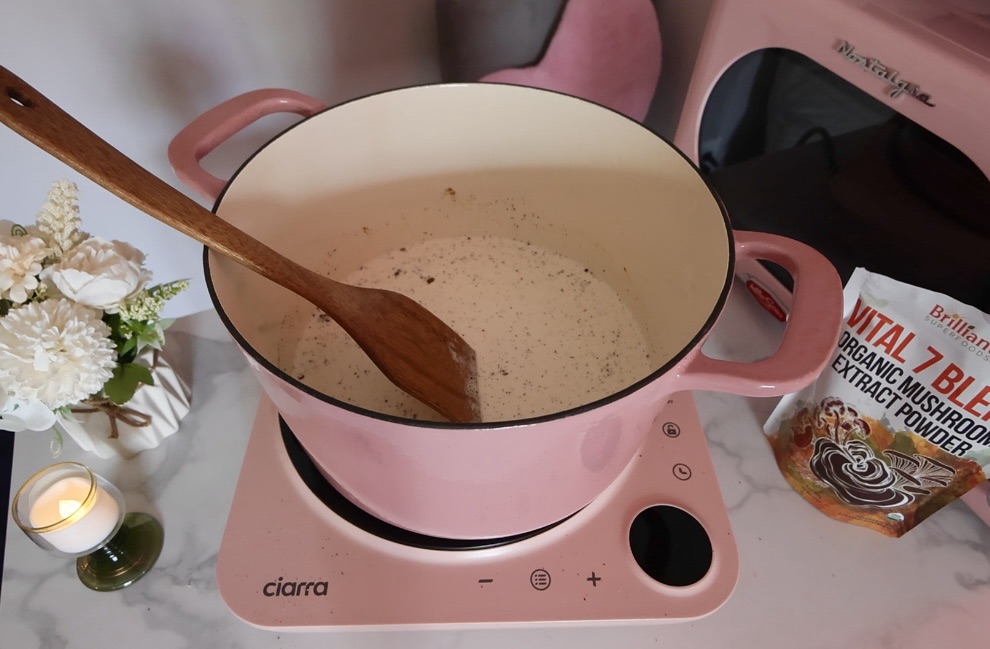 - 1 tsp each mushroom powder and black pepper (add extra at the end to taste)