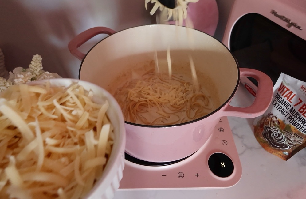 - Bring broth, cream, garlic, seasonings and fettuccine to a boil